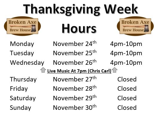 Due to our focus on adult beverages and the ability to freely sample these beverages, a food menu geared towards an adult palette with beer and other alcohol regularly used and still present in a large number of food items, and to foster a relaxing adult atmosphere, The Broken Axe Brew House does not permit minors of any age in the establishment. Thank you for your understanding of this policy